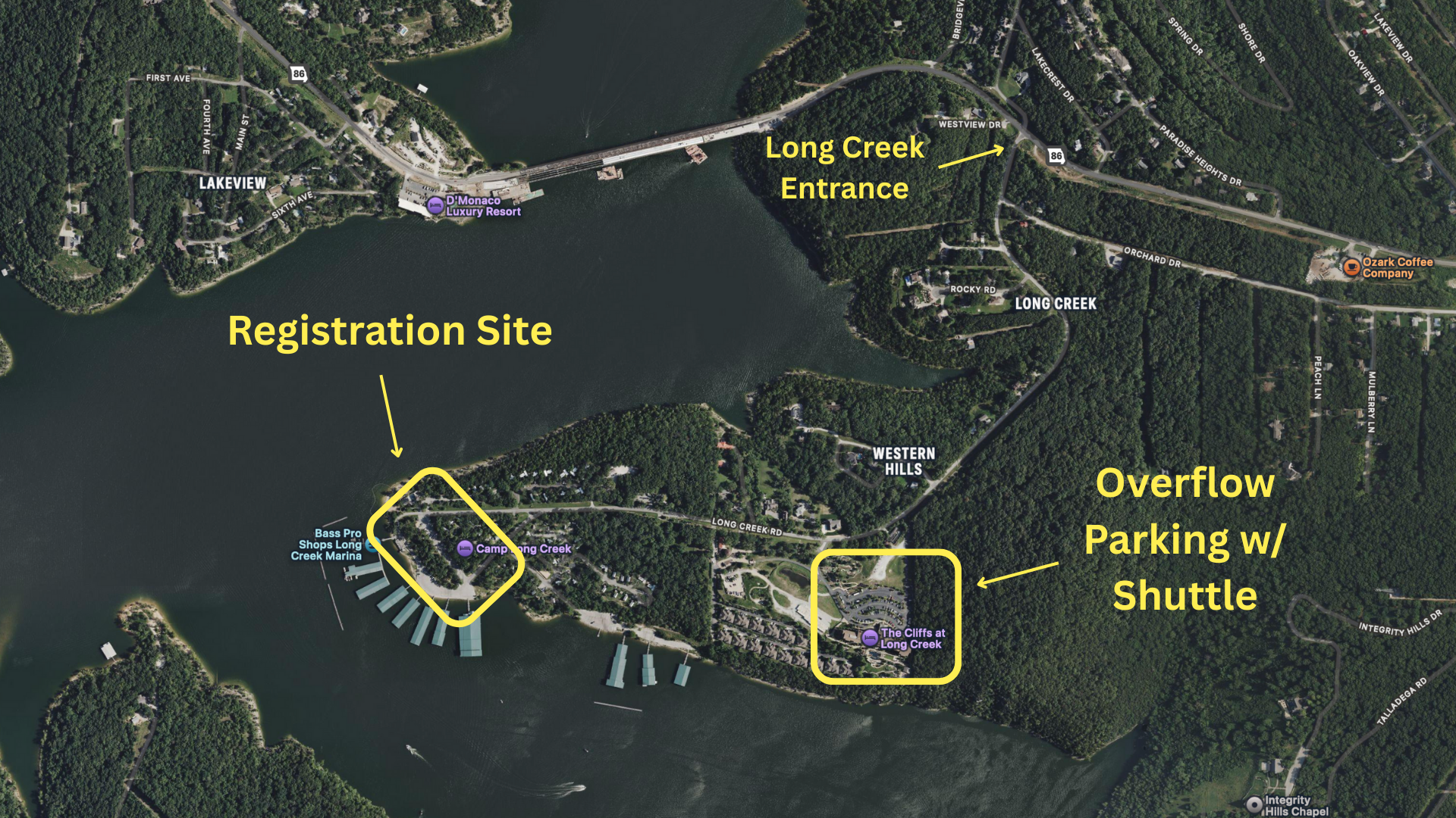 Parking is limited at Long Creek. Please avoid trailering boats & carpool when possible, and follow parking attendants' directions. Overflow parking will be available at The Cliffs at Long Creek with shuttle service to the marina (see map at bottom of page).